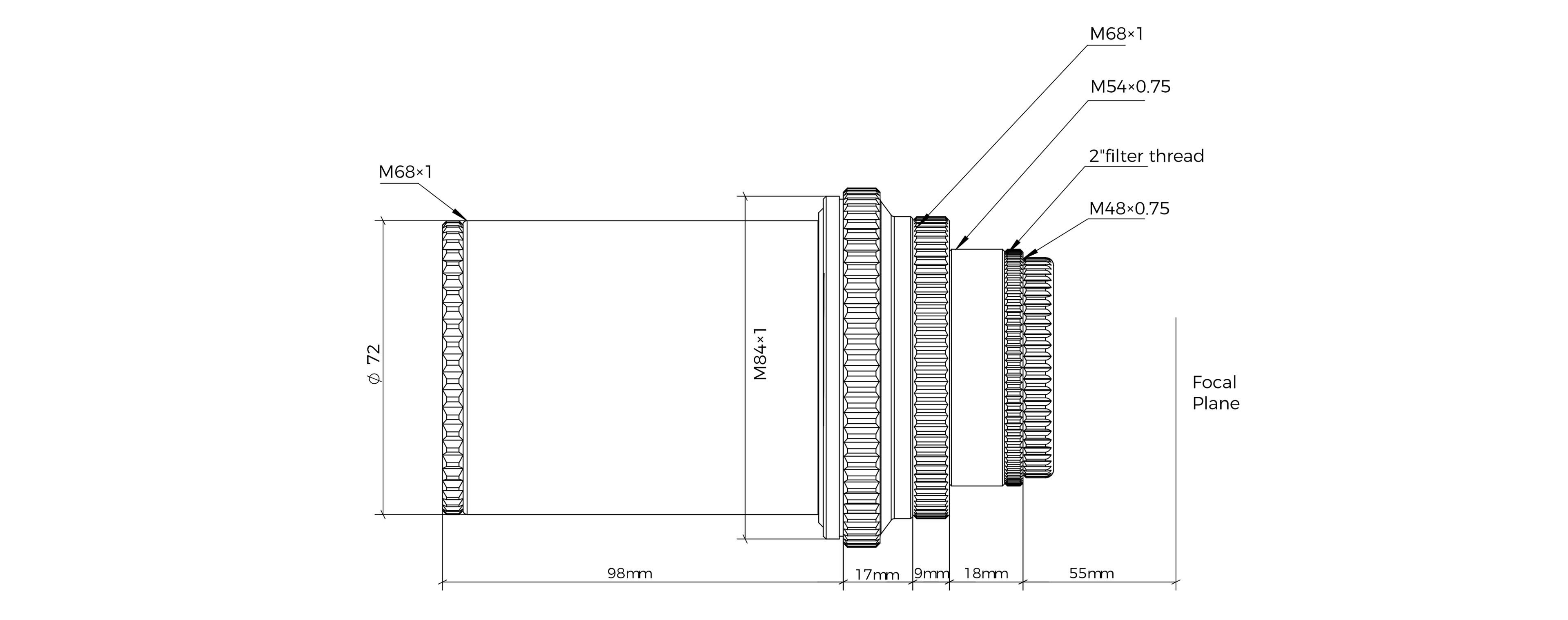 The 0.6 reducer adopts a quadruplet design that also supports a 44mm full-frame image circle. The overall weight is 0.98kg. The back focus from the M48 thread is a standard 55mm. The front thread is M84*1. At the camera end, we have equipped three sizes of adapter? M68*1, M54*0.75, and M48*0.75 for easy subsequent connection and use. At the same time, the built-in M48*0.75 2-inch filter thread can be used to install filters directly. The overall CNC machined, both end threaded metal caps prevent ash when not in use.