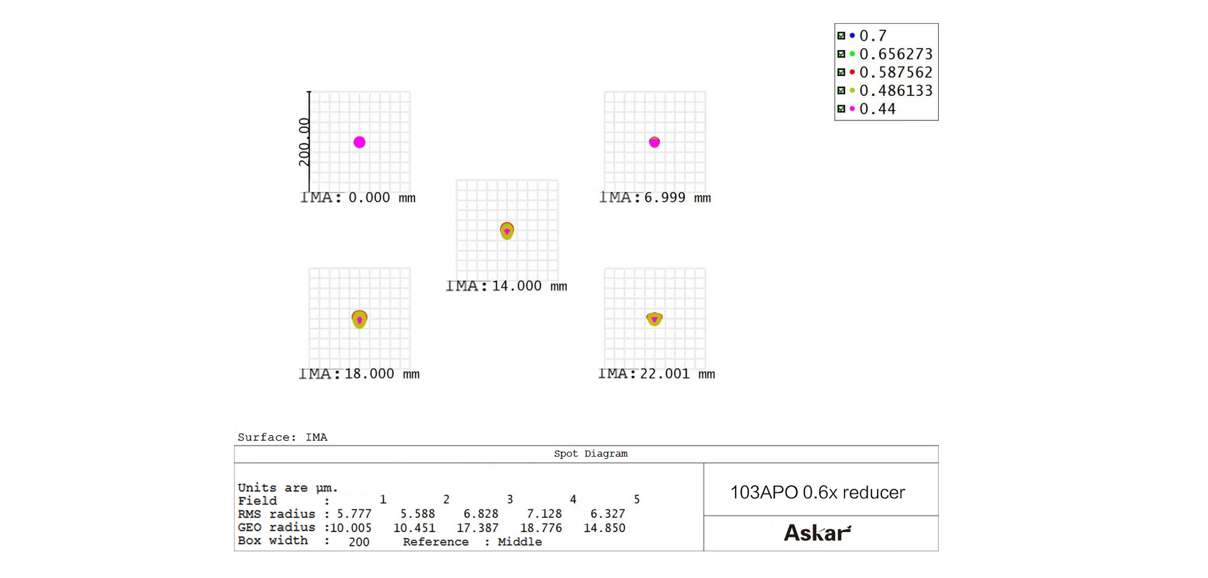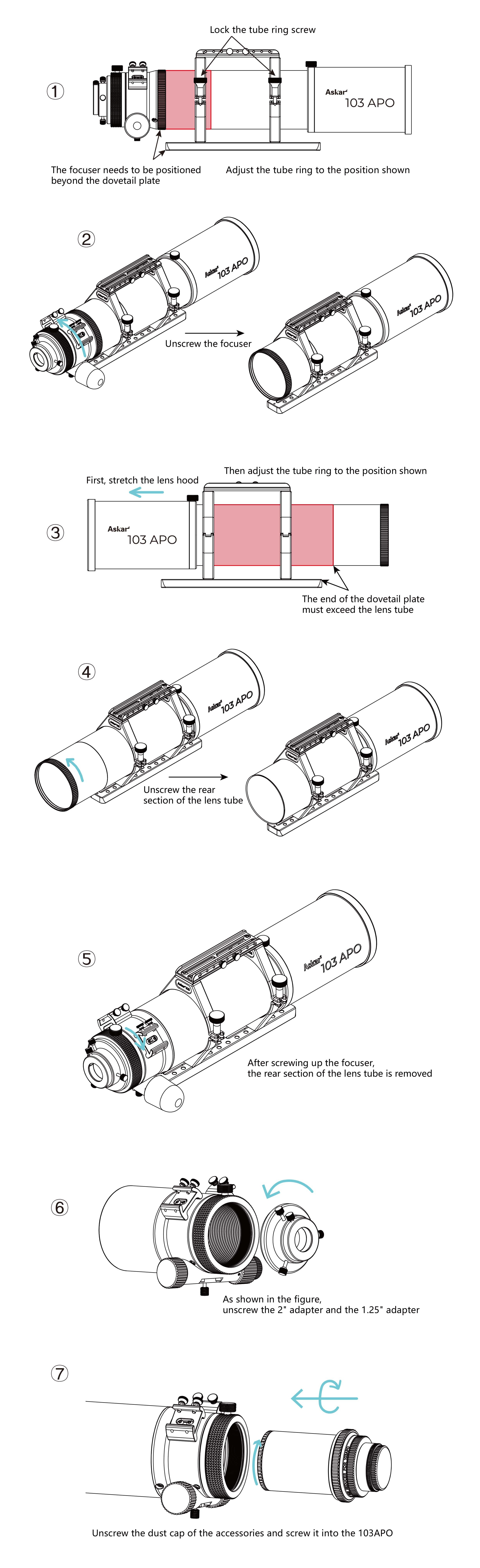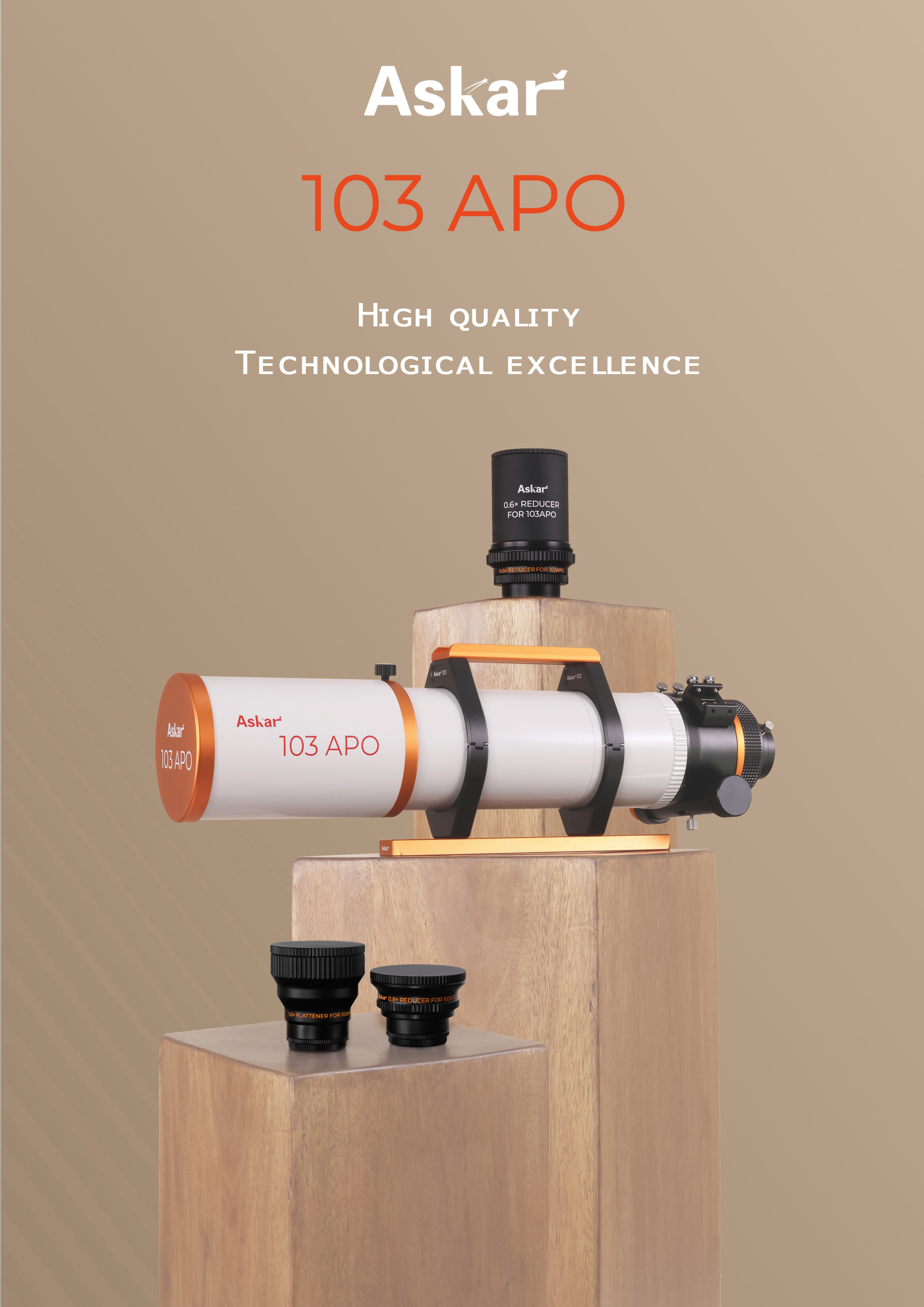 The 0.6x reducer can bring the Askar 103APO’s focal ratio down to F4 while also providing field flattening. Askar 103APO adopts a detachable tube design, where the rear part of the tube can be removed when using the 0.6x reducer, allowing the telescope to have the necessary length to achieve an F4 focal ratio.