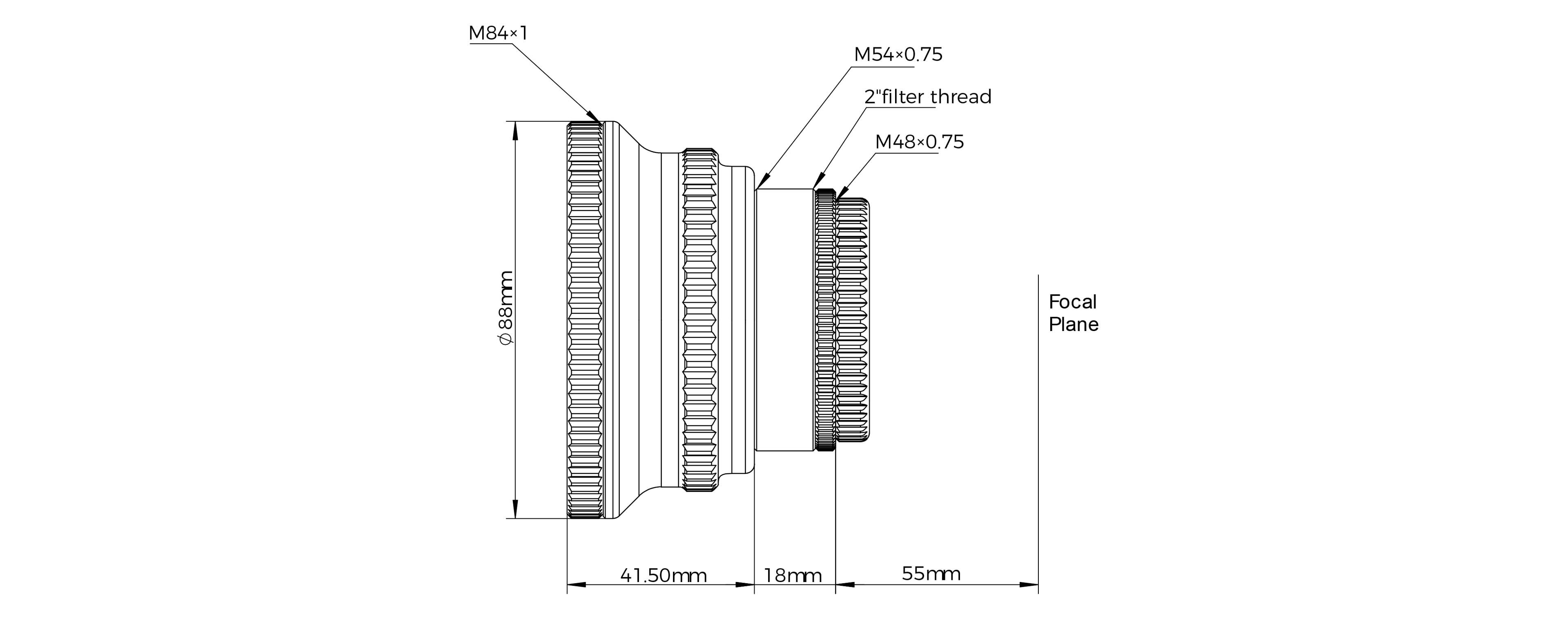 The 0.8x reducer adopts a triplet design and supports a 44mm full-frame image circle. The overall weight is 0.48kg. The back focus from the M48 thread is a standard 55mm. The front thread is M84*1. At the camera end, it is equipped with M54*0.75 and M48*0.75 two sizes of adapters, which are convenient for connection. At the same time, it has a built-in M48*0.75 2-inch filter thread, which can be directly installed and used. The overall CNC machined, both end threaded metal caps prevent ash when not in use.