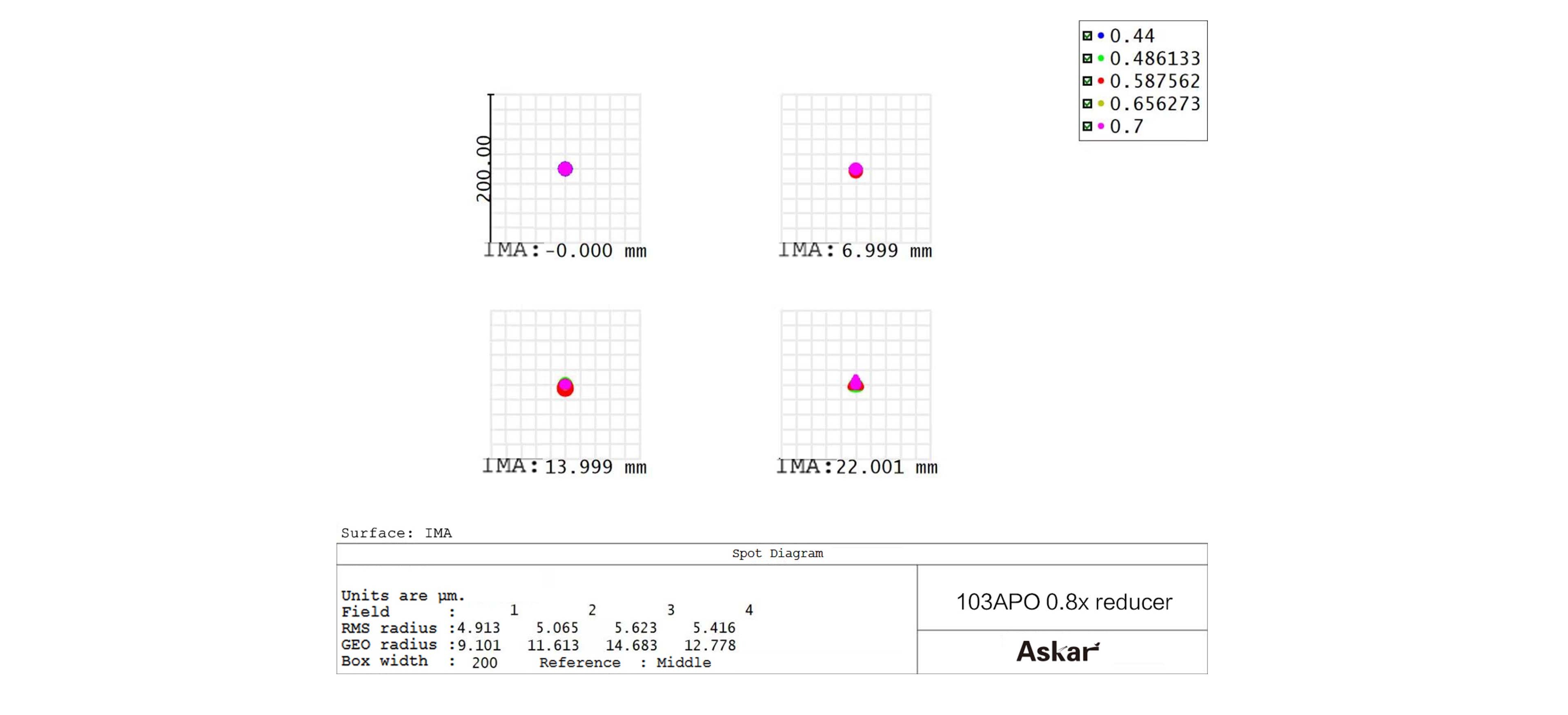 The 0.8x reducer can bring Askar 103APO's focal ratio down to F5.4. This is a standard reducer with field flattening capabilities as well. A shorter focal ratio allows the OTA to have a wider field of view and faster exposure times, making it suitable for capturing large areas of nebulae, star clusters, and faint, fast-moving celestial objects.