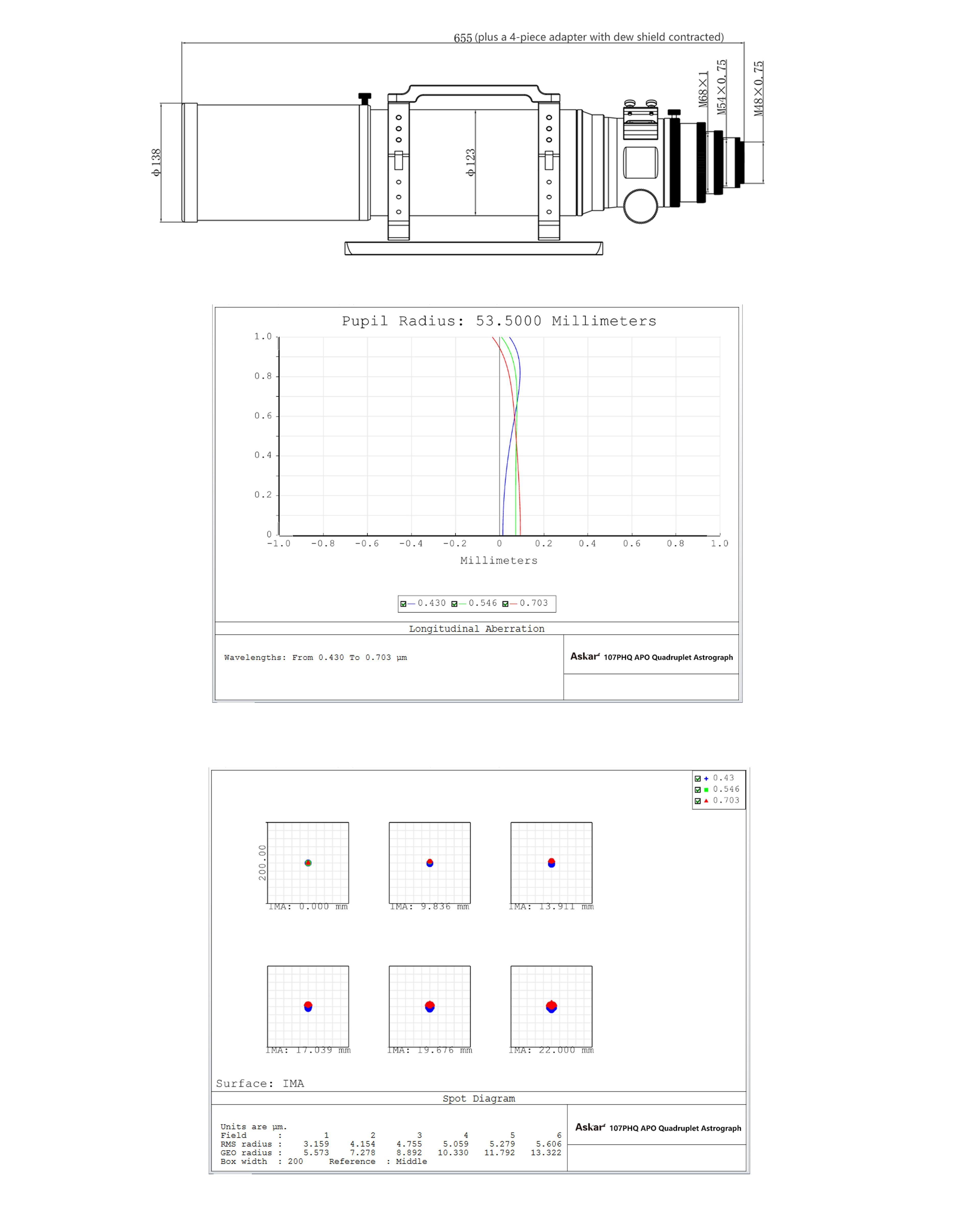 Its integrated flat-field lens significantly enhances the imaging performance of the Askar 107PHQ. It accommodates 44mm full-frame sensors, keeping corner stars well-shaped with minimal distortion. At the center of the field, the RMS radius is just 3μm, satisfying even the most demanding users. The 107PHQ effectively addresses field curvature and vignetting issues.