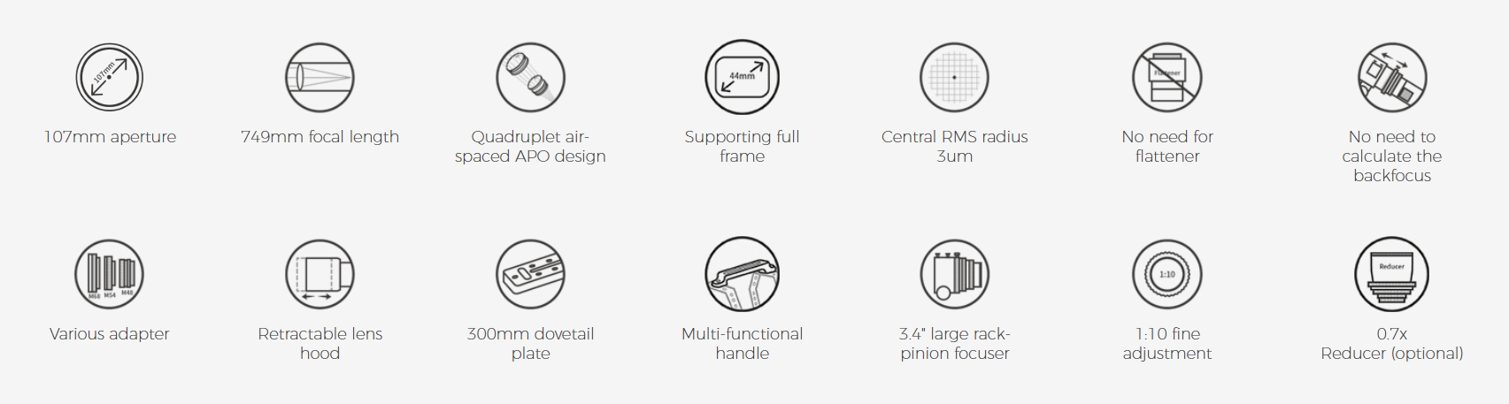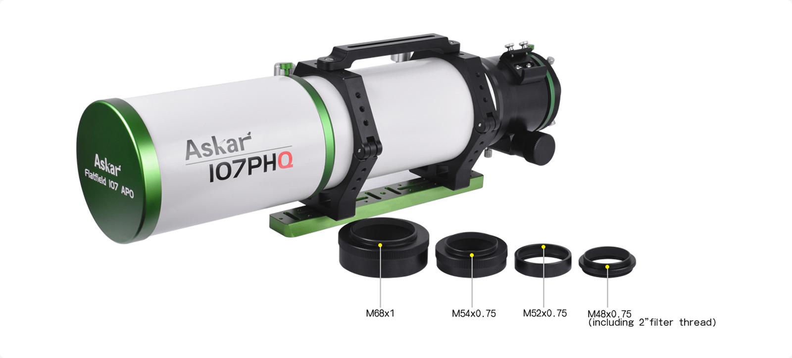 A 107PHQ OTA,a pair of tube rings, a handle, an Askar 300mm Vixen dovetail plate, a set of four-piece photographic adapters, a manual |