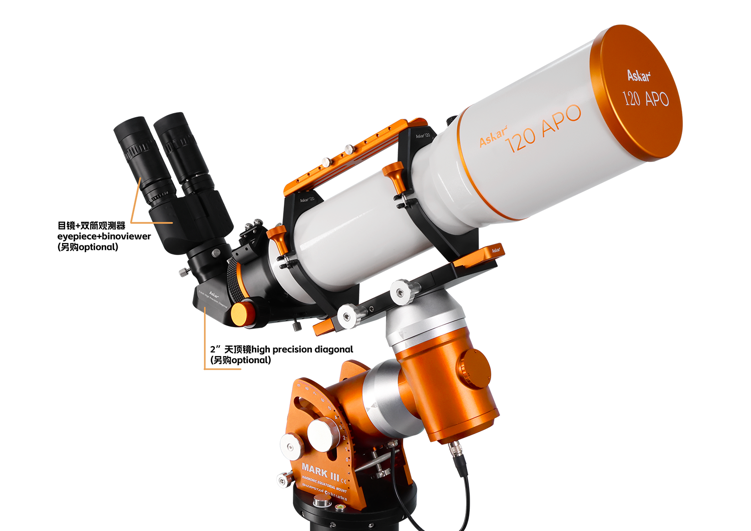 In terms of visual observations, the Askar 120APO pays great attention to observation quality. It can easily achieve focus when connected to 1.25″ or 2″ diagonals or various eyepieces. Because of the segmented lens tube design, it can also be attached to binoviewer for visual observation.