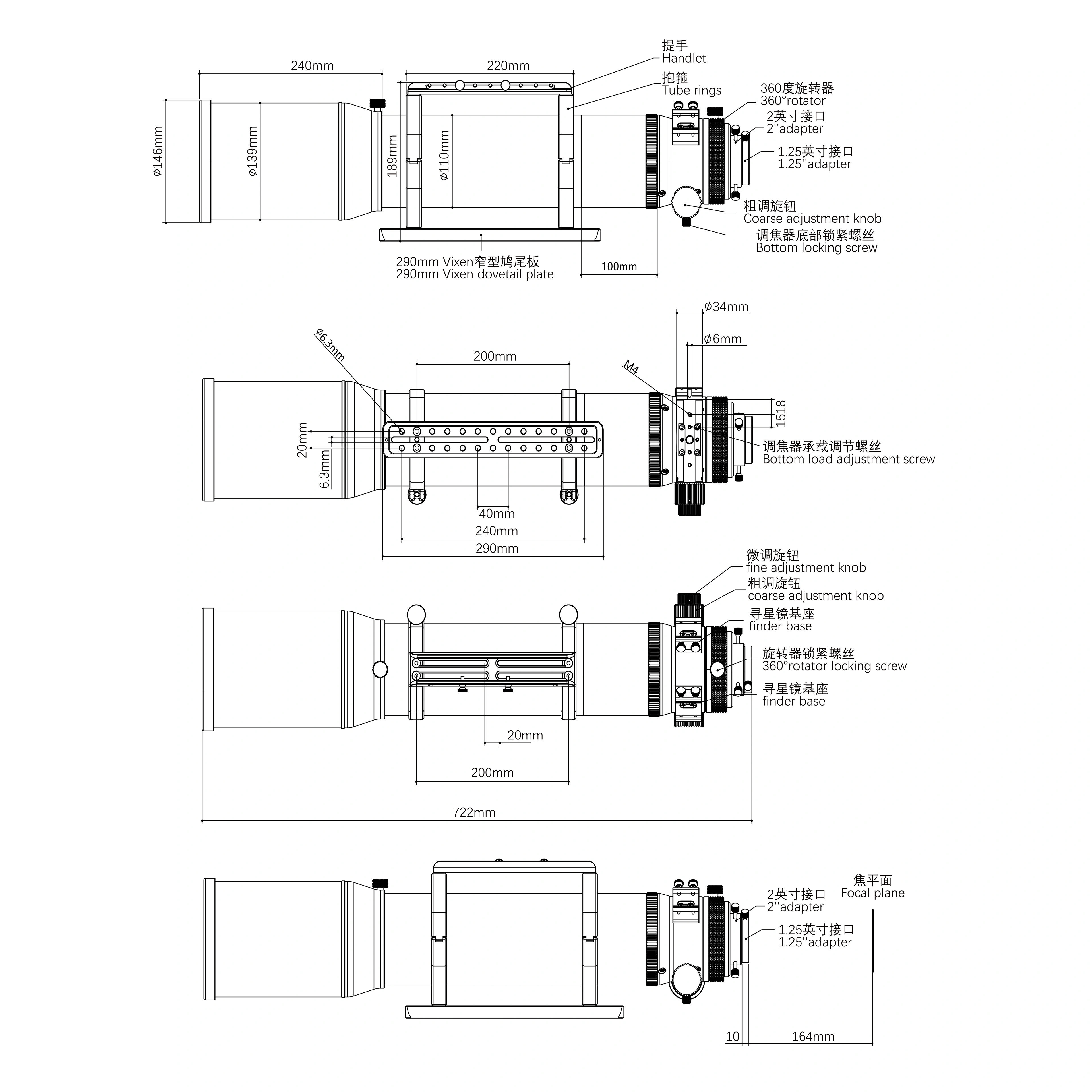 The standard Vixen dovetail plate is compatible with most equatorial mounts and bases on the market. We extended the length and added screw holes, making the plate becoming 290mm which is more easy to balance on the mounts. With the slot on the handle, the spacing between the tube ring can be adjusted as desired. Additionally, there is also a Losmandy dovetail plate available for purchase, to be used with different equatorial mounts.