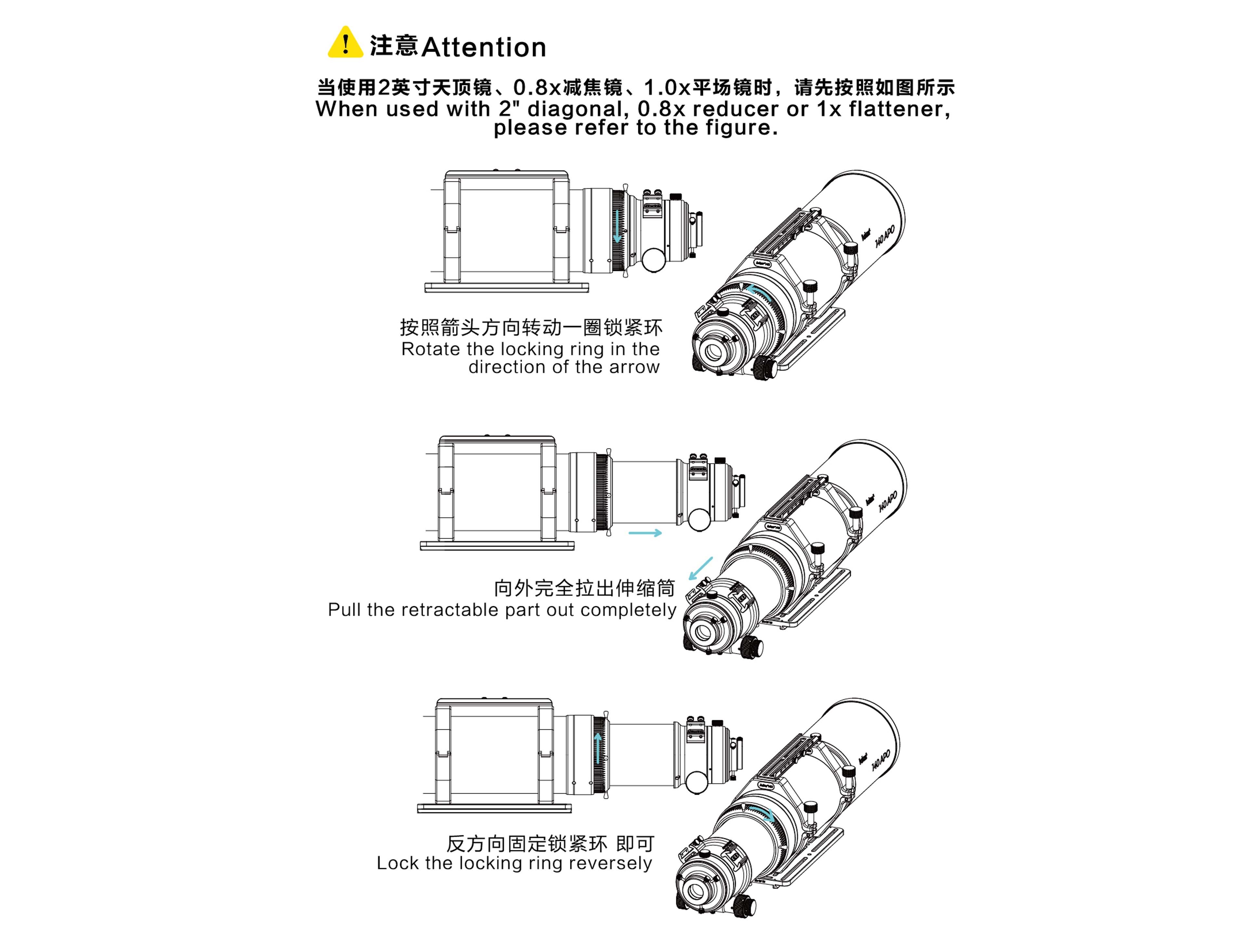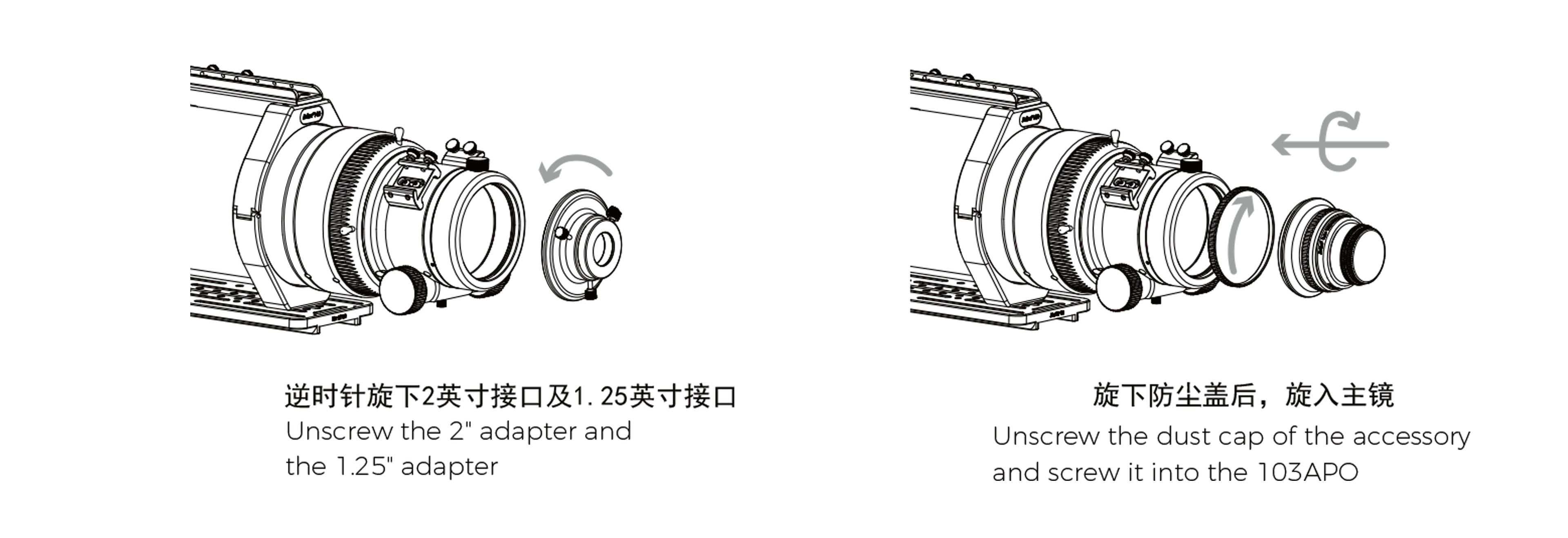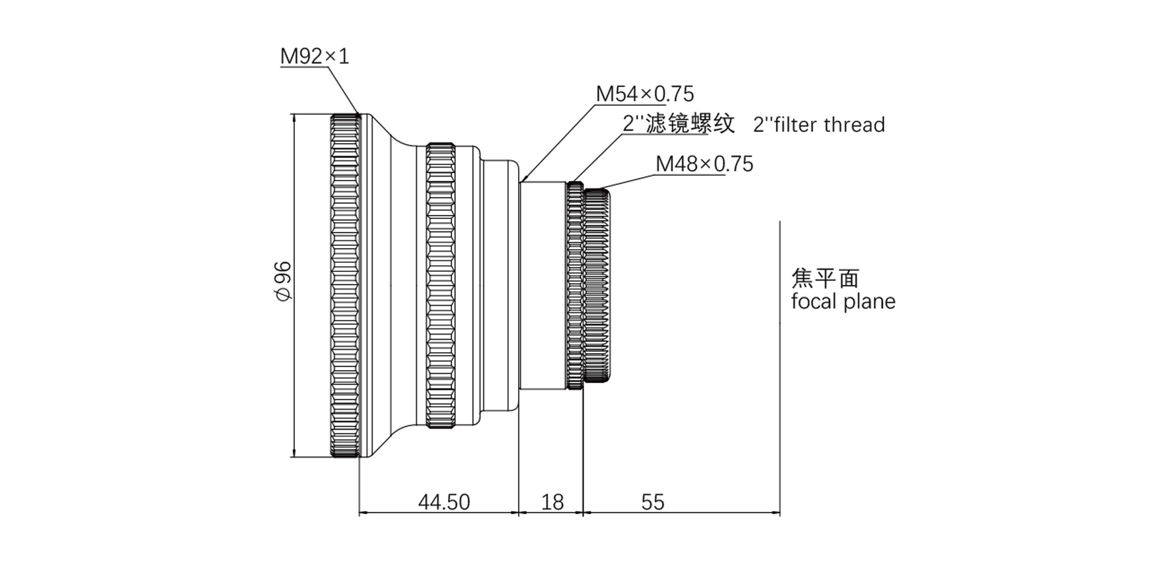 The 0.8x reducer adopts a triplet design and supports a 44mm full-frame image circle. The overall weight is 0.75kg. The back focus from the M48 thread is a standard 55mm. The front thread is M92*1. At the camera end, it is equipped with M54*0.75 and M48*0.75 two sizes of adapters, which are convenient for connection. At the same time, it has a built-in M48*0.75 2-inch filter thread, which can be directly installed and used. The overall CNC machined, both end threaded metal caps prevent ash when not in use.