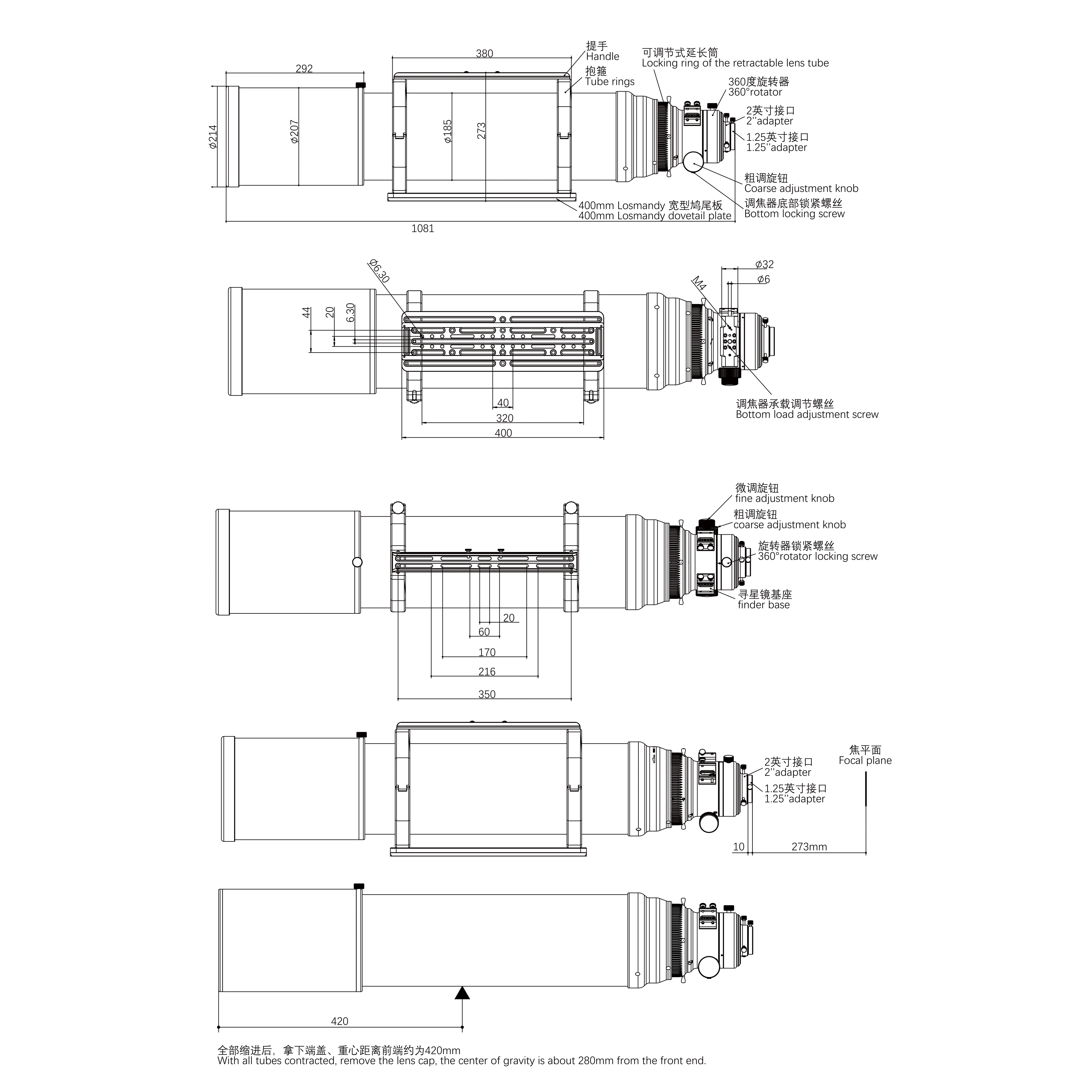 | Instruction of using the 185APO retractable lens tube (for eyepiece observation, 1.0x flattener, and 0.8x reducer) |