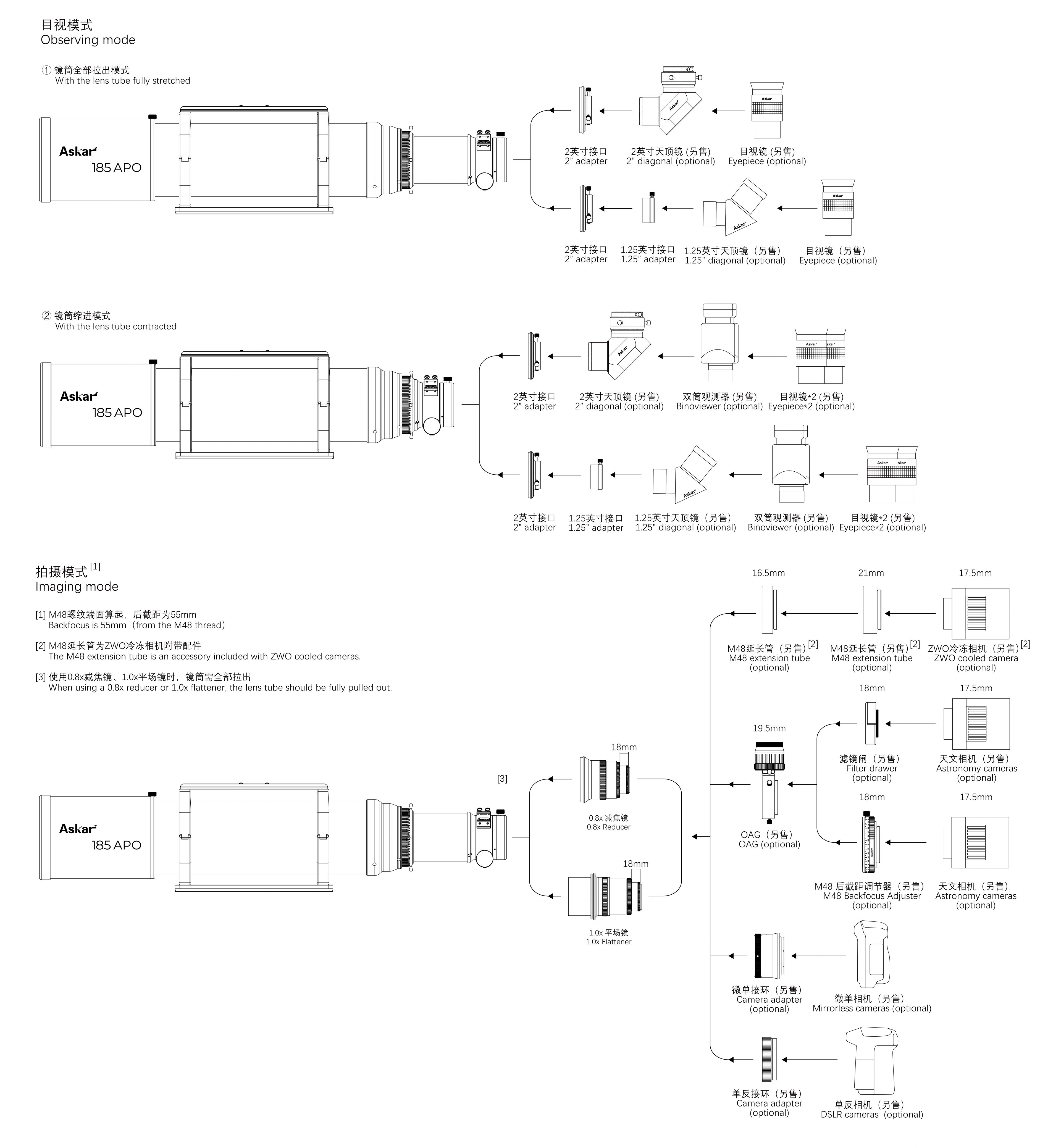 When the lens tube is contracted, the Askar 185APO can be used with a binoviewer for visual observation. When the lens tube is stretched, the 185APO can be connected with a specific 0.8x reducer or 1.0x flattener for imaging or a diagonal and eyepiece for observing.