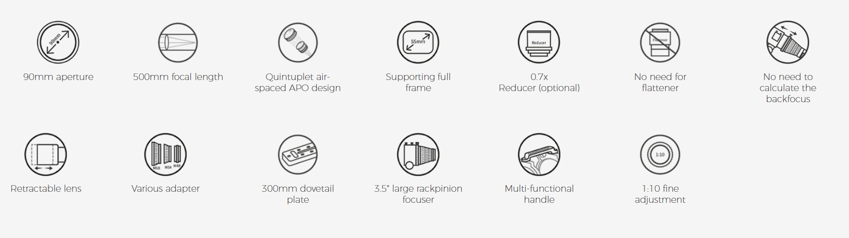 Askar FRA500 has inherited the legacies of superior FRA- series designing. It boasts a quintuplet air-spaced APO optical structure, a “three plus two” Petzval lens combination. The front lens group consists of three lenses (including two pieces of ED glass) for excellent correction of aberrations. The posterior group is composed of two lenses separated by small space which is able to provide fine sharpness across the whole image. You may barely detect any blurry star at the edge of the image. FRA500 supports an image circle of amazing 55mm, much larger than the standard 44mm full-frame image circle. Its special back-focus design frees users from calculating confusing back-focus distance or rummaging around for a proper spacer. What you need to focus on is just to make your target stay in focus.