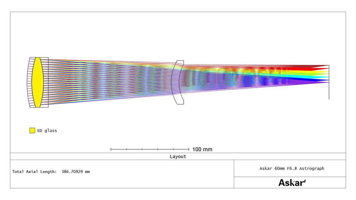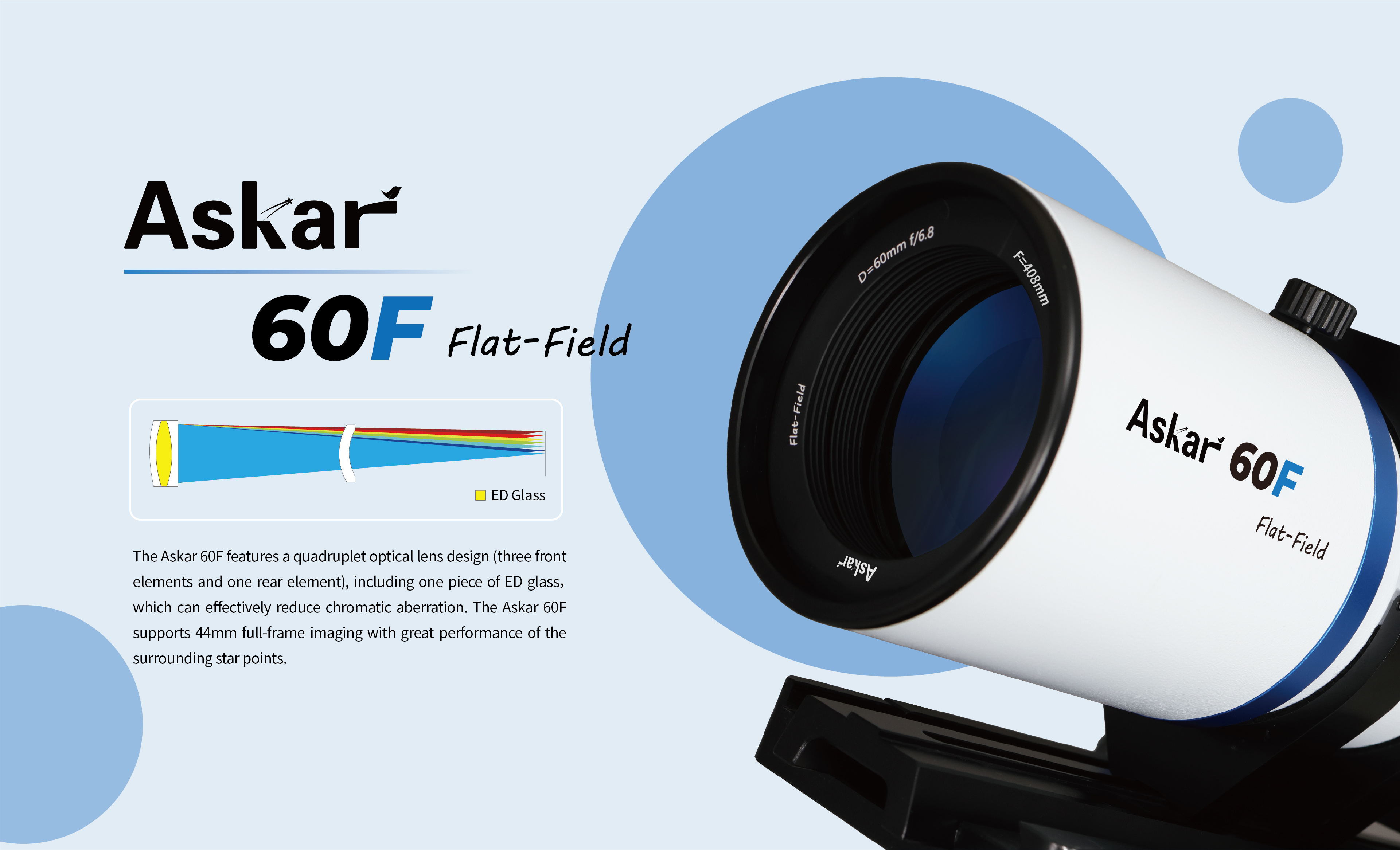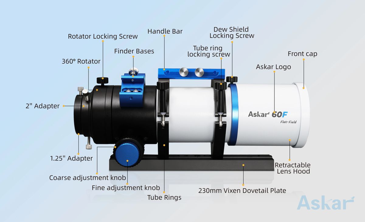 The Askar 60F is an optical tube assembly with a 60 mm aperture, a 408 mm focal length, and a native focal ratio of f/6.8, created for astronomy users who value portability along with excellent image quality.