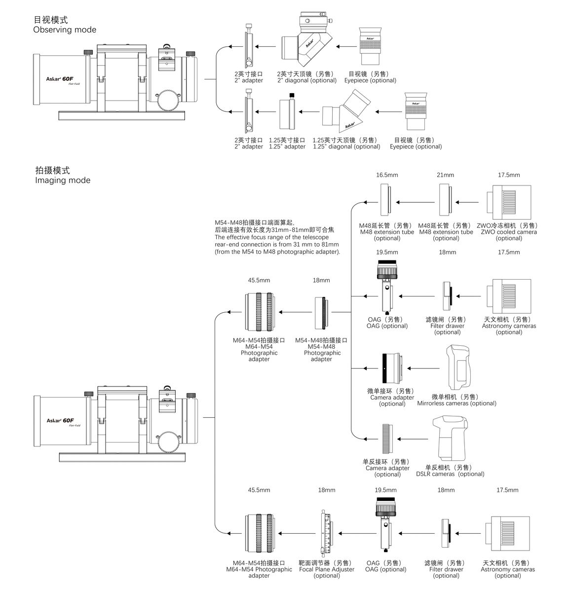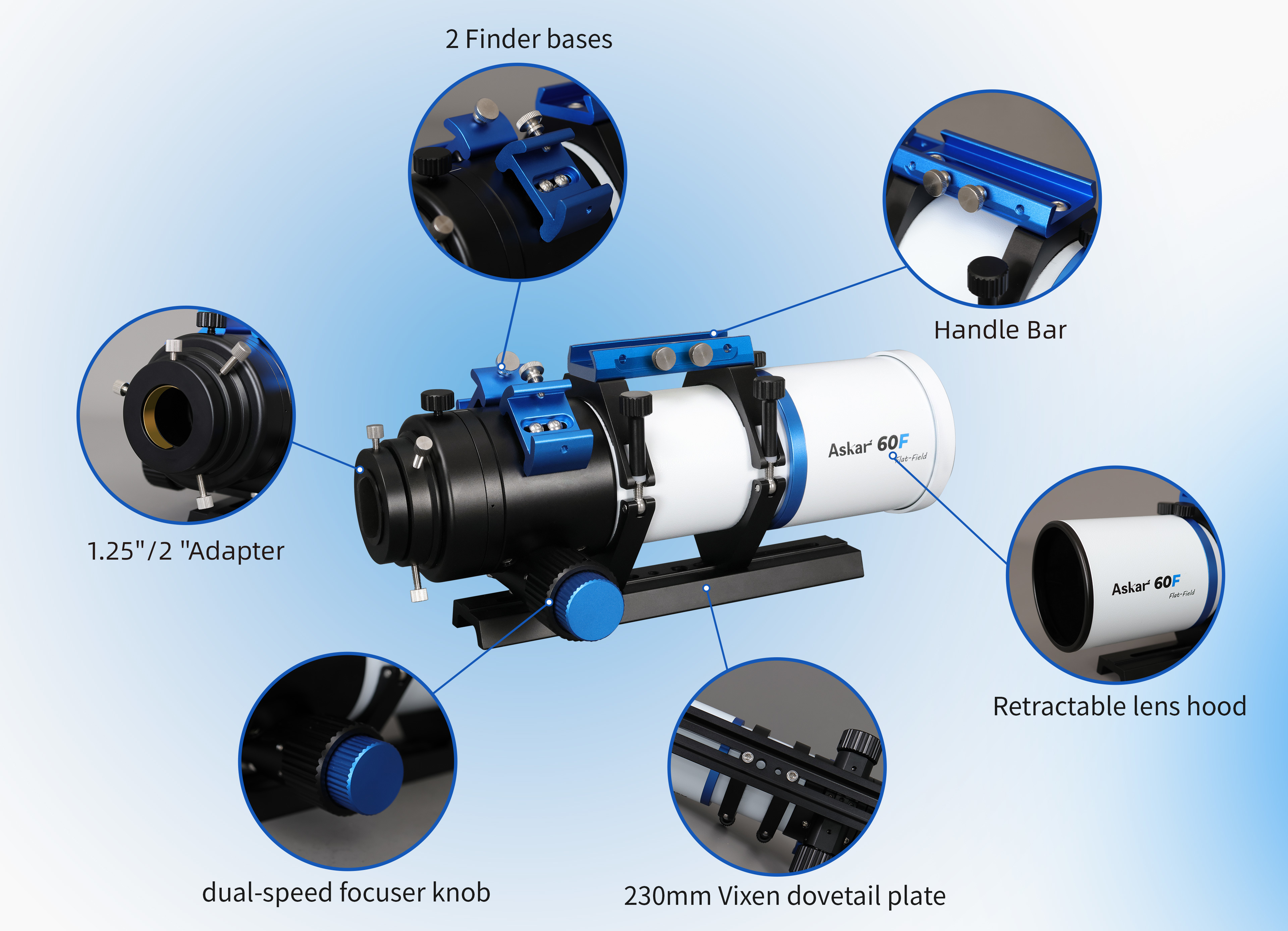 Designed for both visual viewing and imaging, the Askar 60F includes a dedicated photographic extension tube with a 2" internal filter thread, and it comes equipped with M48×0.75 and M54×0.75 adapters. This ensures quick, direct compatibility with DSLRs and astronomy cameras, enabling fast setup and immediate shooting.
