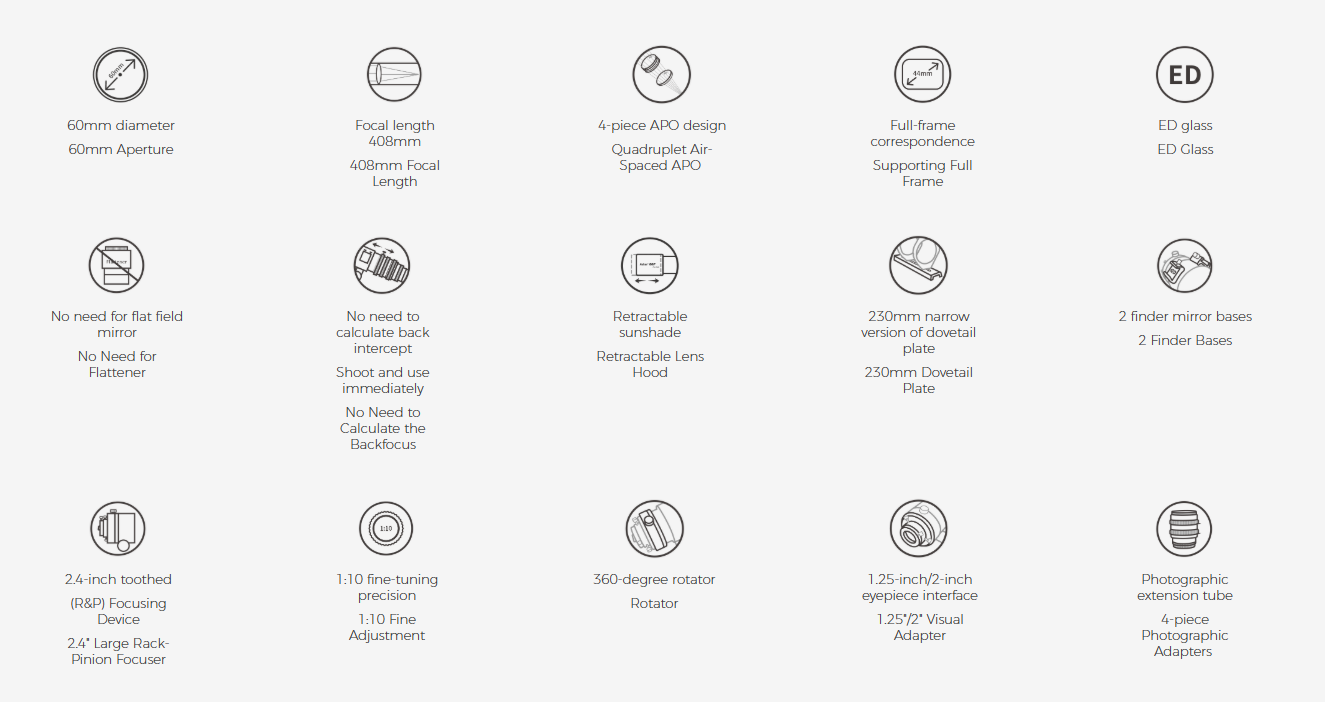 The OTA alone weighs 2.5 kg, with a total package weight of 3 kg when including the tube rings and dovetail plate. Its compact, lightweight build makes it ideal for travel, allowing observers and imagers to take it virtually anywhere.