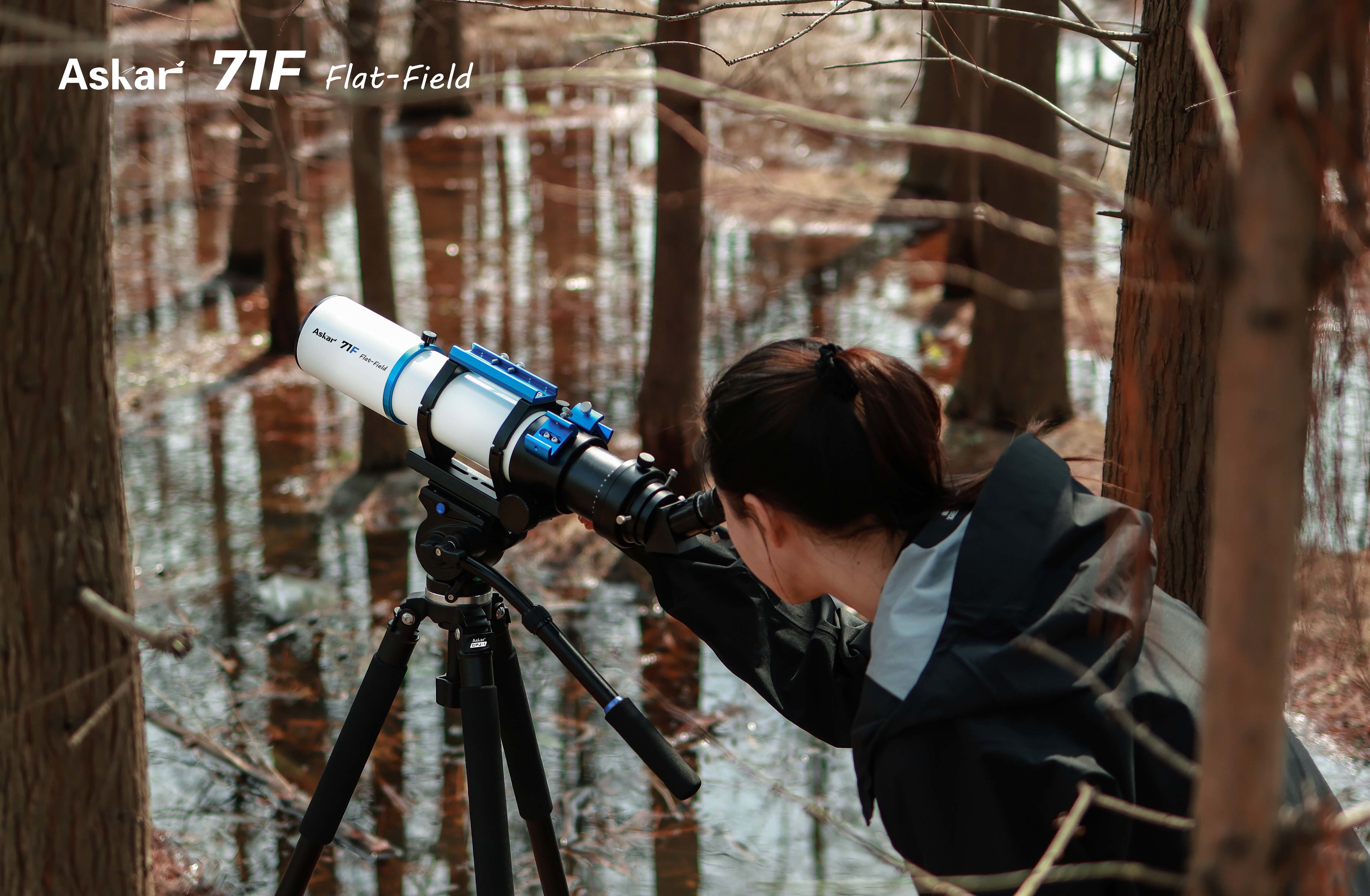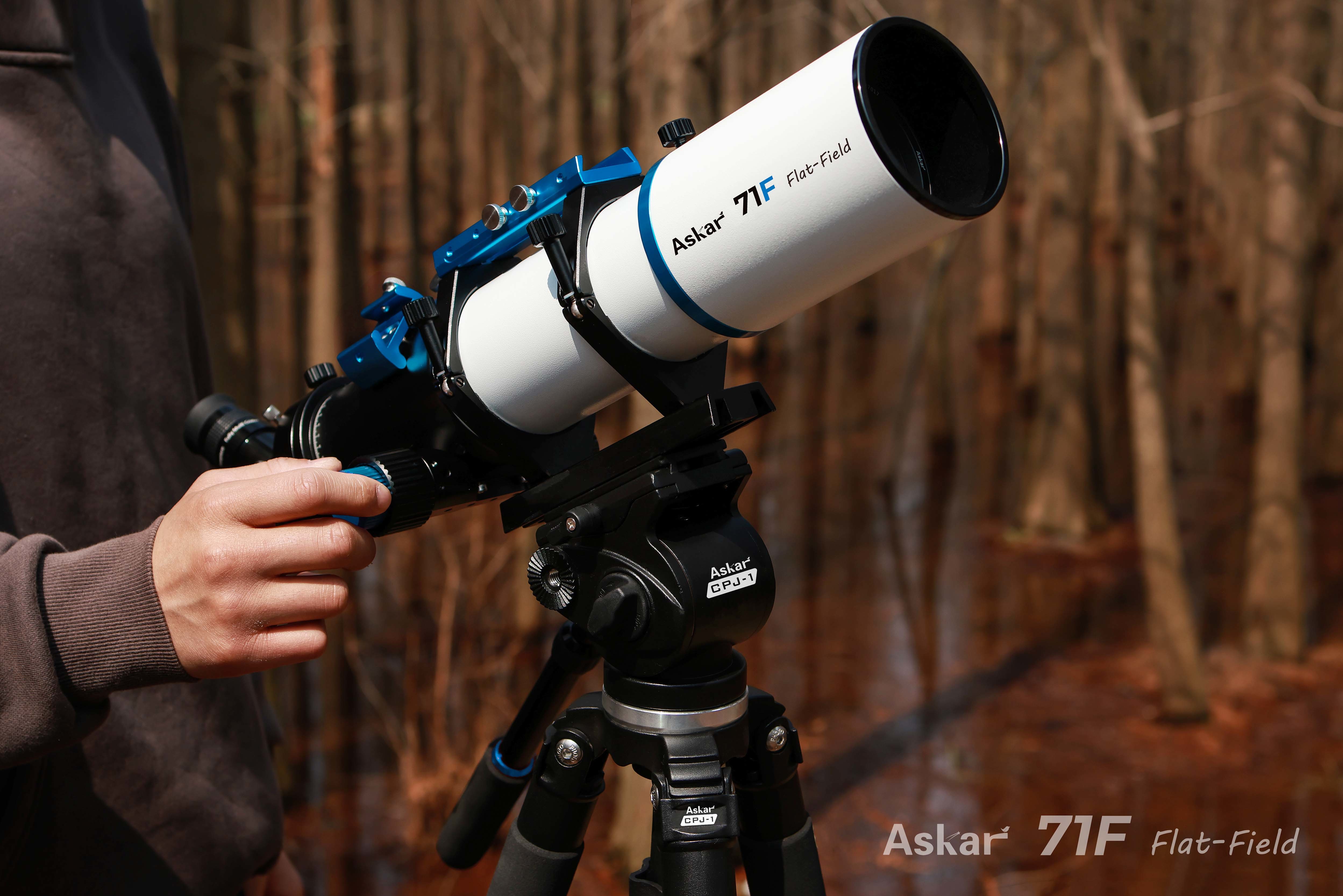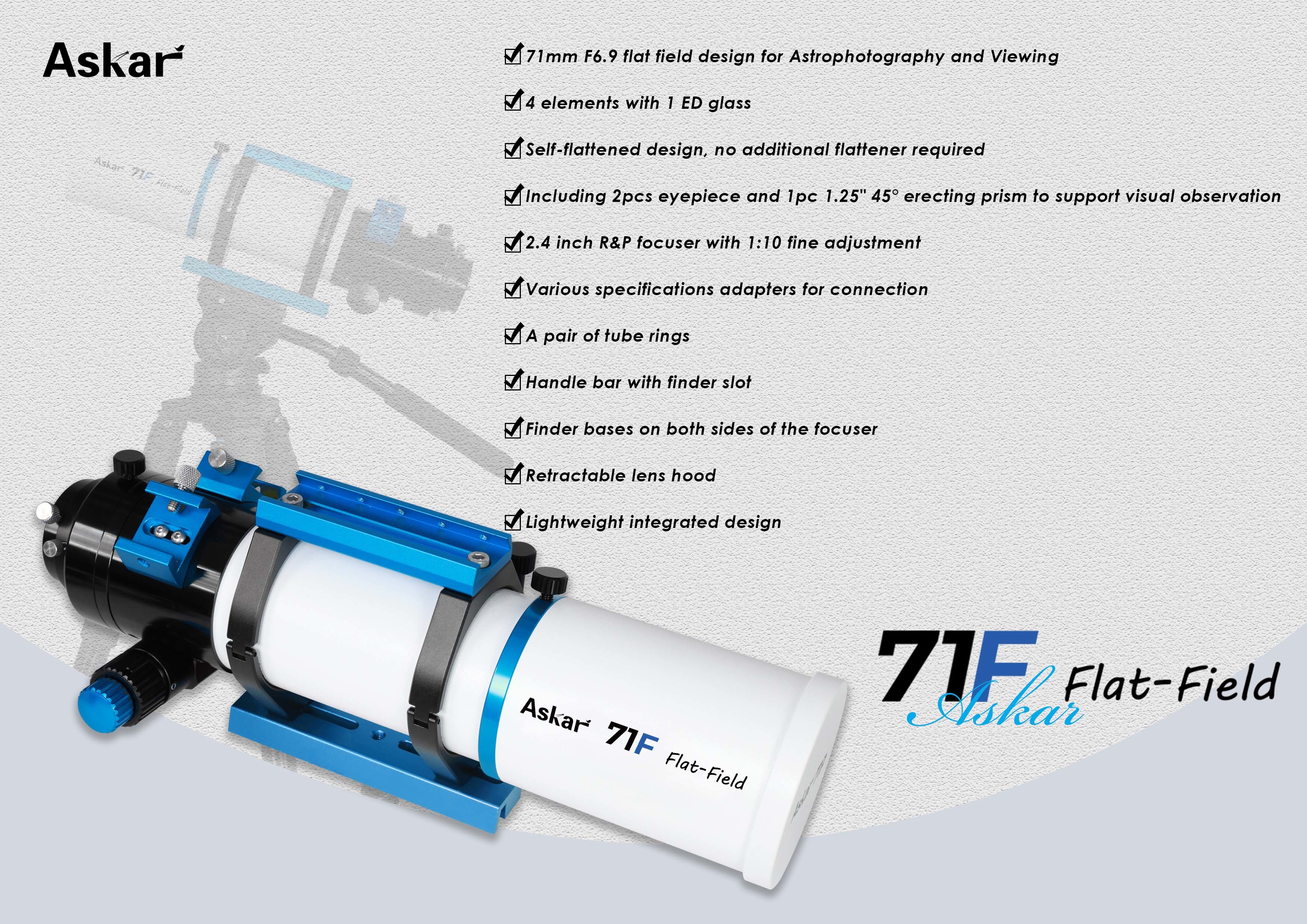 The Askar 71F is an optical tube assembly featuring a 71mm aperture, a 490mm focal length, and a native focal ratio of F6.9.