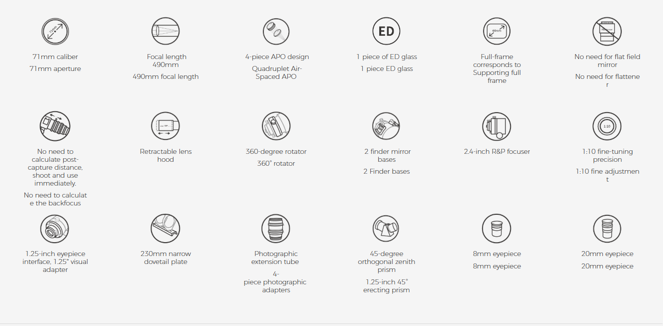 The telescope uses a quadruplet air-spaced APO optical system that incorporates one ED glass element, effectively minimizing chromatic aberration. It supports 44mm full-frame imaging with excellent star quality across the entire field.