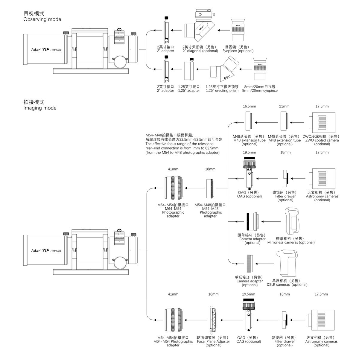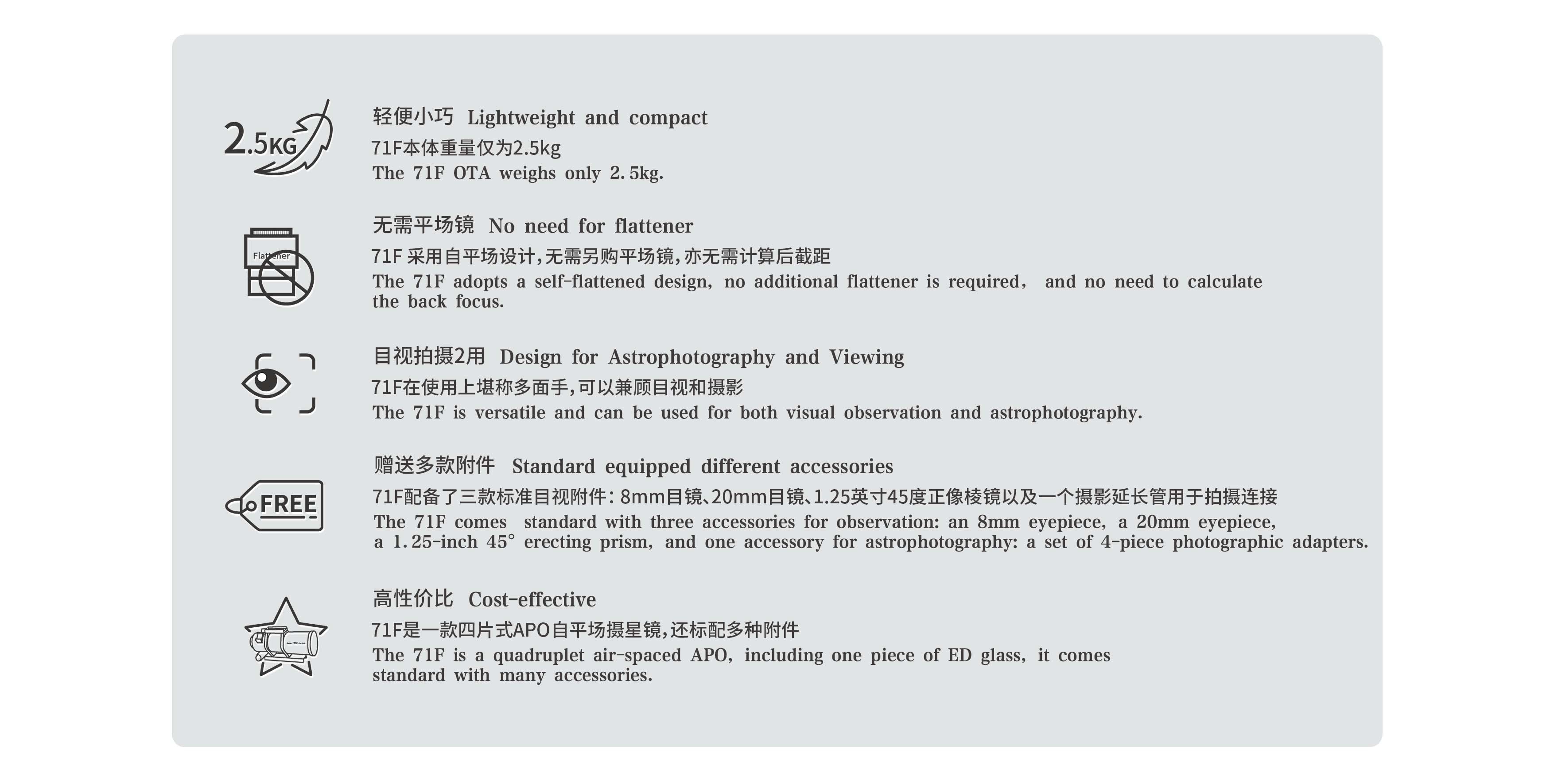 The Askar 71F serves both visual observers and astrophotographers. To enhance user convenience, it comes standard with three observing accessories: an 8mm eyepiece, a 20mm eyepiece, and a 1.25-inch 45° erecting prism.