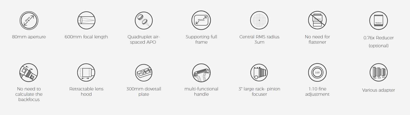 | Objective lens | Quadruplet air-spaced APO (including two ED glass) |