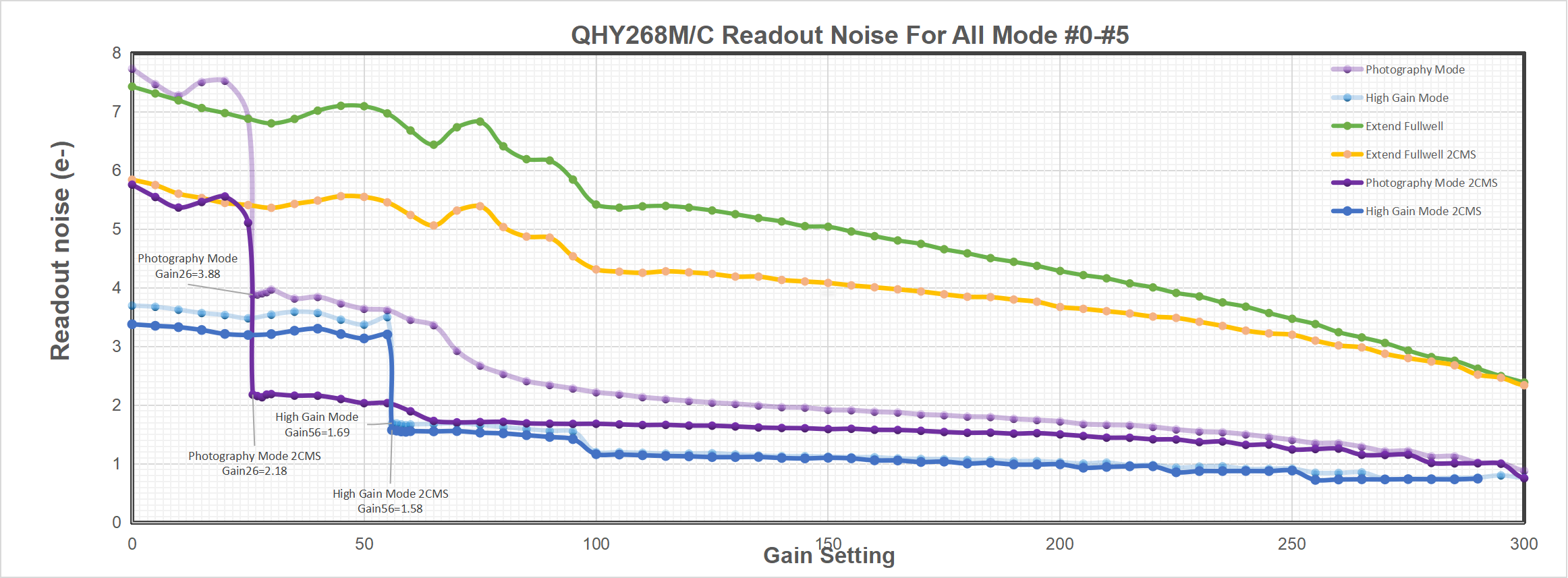 These modes are especially advantageous for astrophotography, where minimizing noise is critical. It's also worth noting that the recommended gain settings remain consistent with those of the original (non-2CMS) modes.
