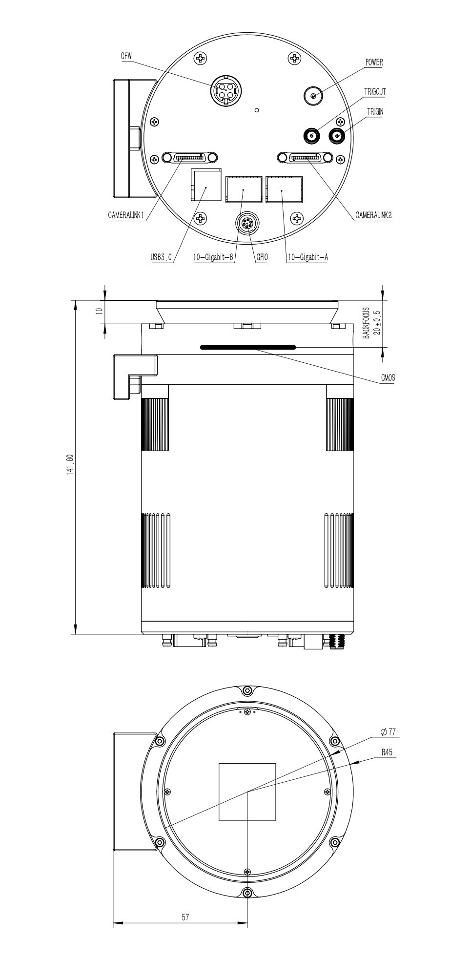 The device features a 6-pin general-purpose input/output (GPIO) port, configurable for various functions. QHYCCD can customize these settings based on user needs, or users may reprogram the internal FPGA to support more complex operations.