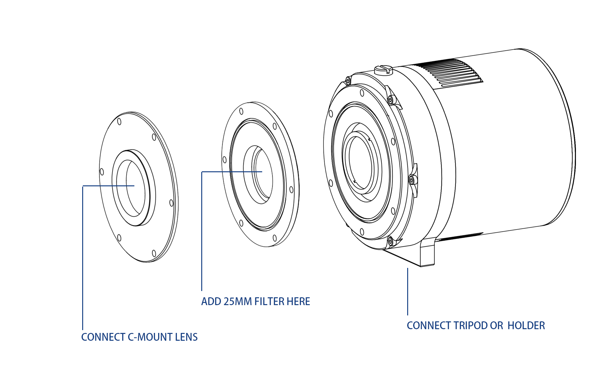 Support C-Mount, 1.25 inches (with adapter) Support D=25mm and D=25.4mm filters. |