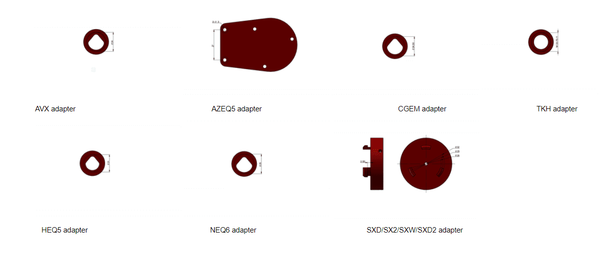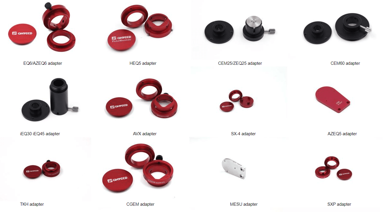 PoleMaster can be mounted onto virtually any equatorial mount using the appropriate adapter. Even mounts with only a single RA axis and no declination correction benefit from it. Once the polar axis is accurately aligned, drift in the declination direction is greatly reduced, improving performance significantly even for basic mounts.