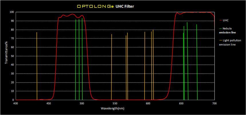 The UHC (Ultra High Contrast) broadband filter is designed to improve the visibility of various deepsky objects. By selectively reducing the transmission of wavelengths of light pollutants, specifically those produced by artificial lightings including mercury vapor lamps, both high & low pressure sodium vapor lights and the unwanted natural light caused by neutral oxygen emission in our atmosphere (i.e. skyglow). Together with the highly transparent in main nebula emission lines at OIII(496nm and 500nm), H-beta (486nm), NII(654nm and 658nm), H-alpha(656nm) as well as SII(672nm), the filter is suitable for enhancing the contrast and details for both visual and photograghic purpose at sub-rural area with heavy light pollution.