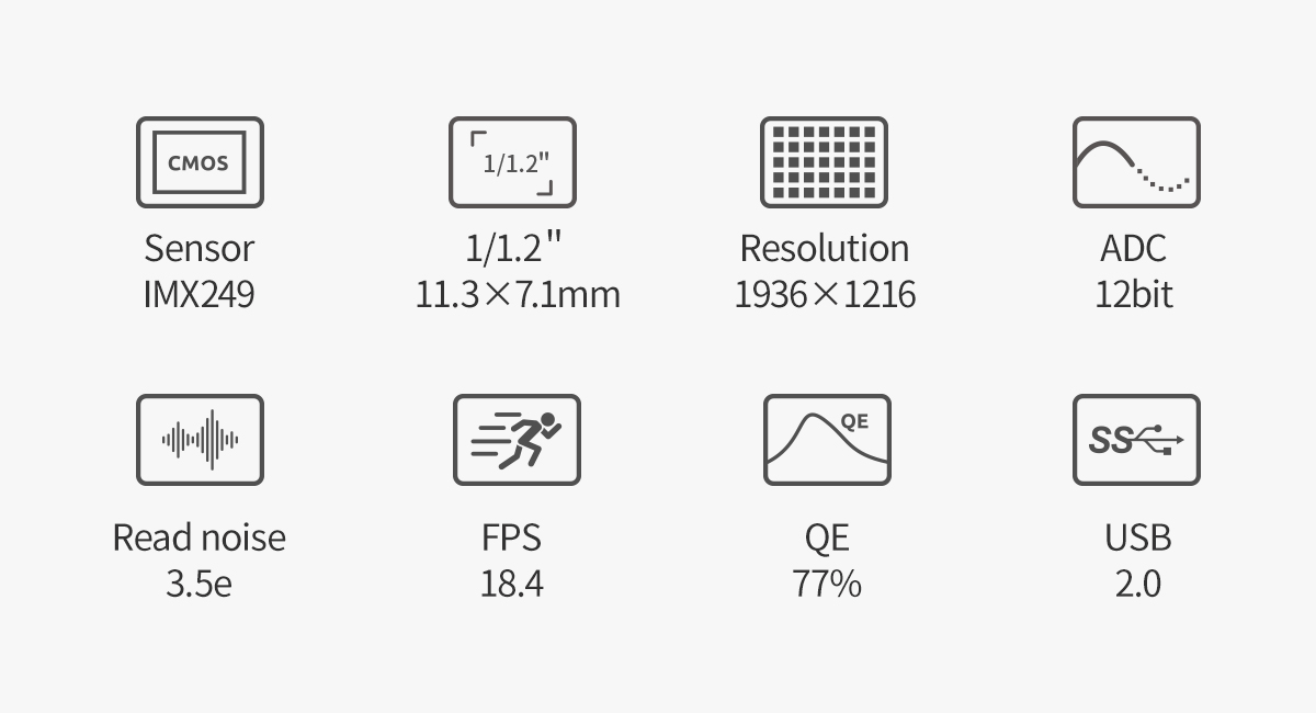ASI174MM Mini camera integrates Sony IMX174LLJ / IMX174LQJ 1/1.2″ sensor (11.3 mm x 7.1 mm). It is the first model in the “mini”-series of cameras from ZWO. This camera has 1936 x 1216 pixels with a pixel size of 5.86 μm x 5.86 μm. It camera provides 12-bit ADC and its QE peak is 77%.