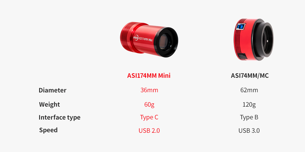 Compared with the ASI174MM camera, the new 174-Mini has a sleeker design, less weight, and it can reach focus at the same position as an eyepiece.