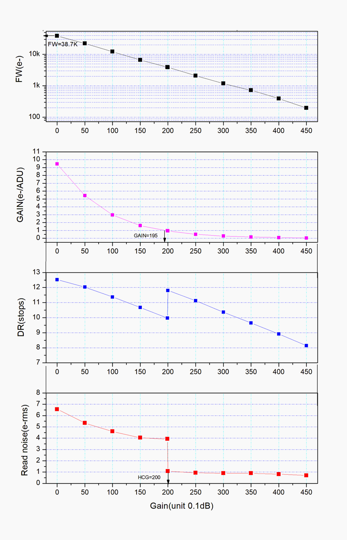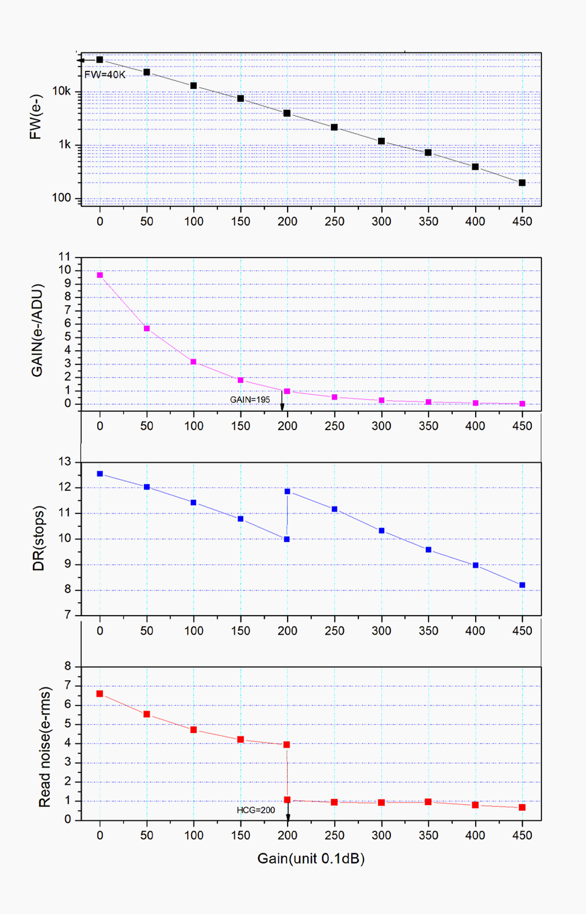 The camera has a built-in HCG mode, which can effectively reduce readoutnoise at high gain and allow the camera to maintain the same high dynamicrange as it does at low gain. When the gain is 200, the HCG mode isautomatically turned on and the Dynamic range reaches a level close to 12bit.The readout noise is as low as 0.7e.