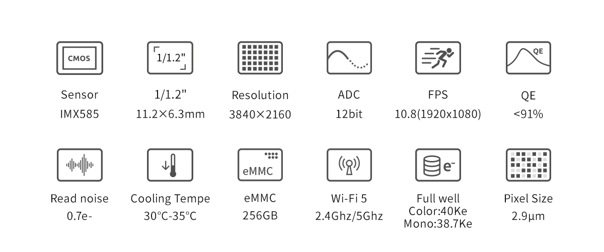 The ASI585MC/MM Air integrates imaging, guiding, and smart control, featuring ZWO’s self-developed “Dual Sensor + ASIAir” integration technology. Say goodbye to complex setups and enjoy a seamless, hassle-free astrophotography experience.