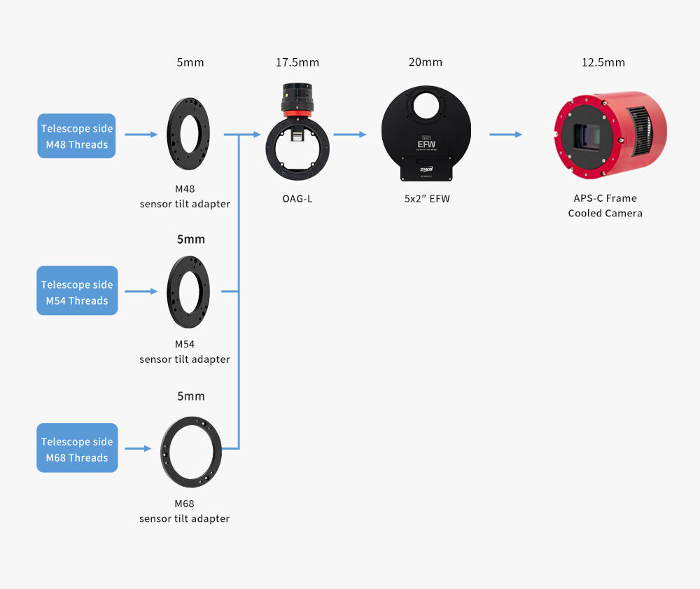The ZWO Electronic Filter Wheel (EFW) comes in four versions, each compatible with one of the following filter formats: