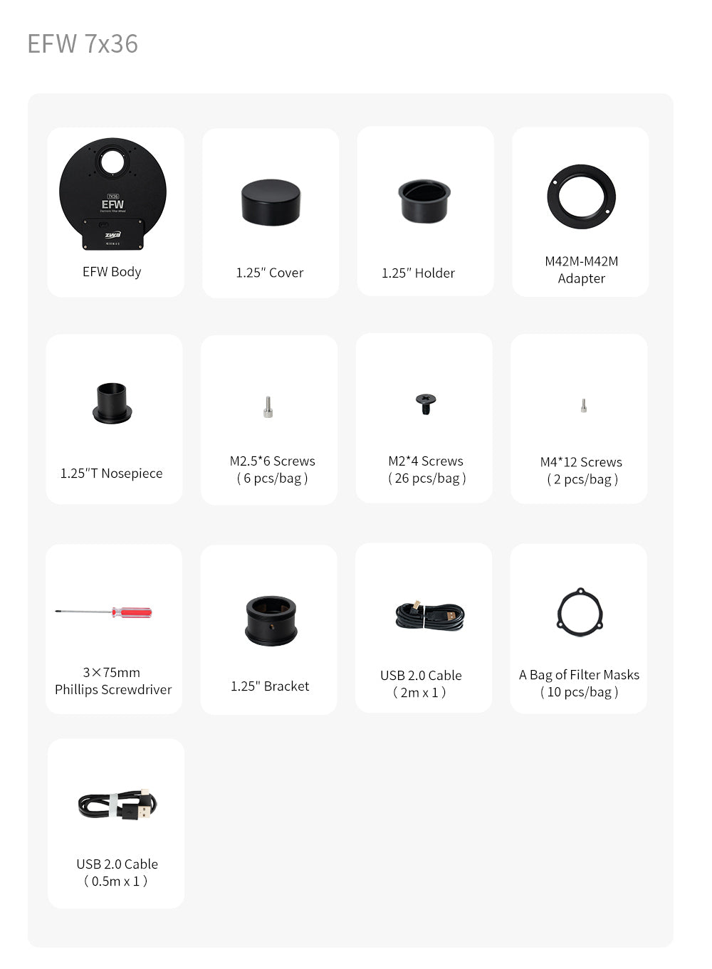 The ZWO Electronic Filter Wheel (EFW) comes in four versions, each compatible with one of the following filter formats:
