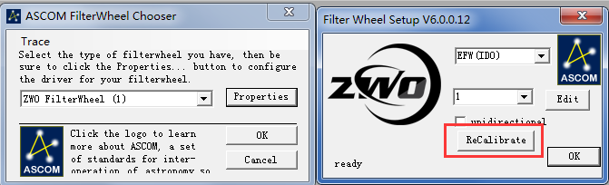 ZWO EFW uses an infrared sensor to check wheel position. If the sensor malfunctions, you can usually resolve by recalibrating the EFW in the ASCOM driver. Simply click “ReCalibrate” in ASCOM driver interface. It can take up to 60 seconds to perform this action.