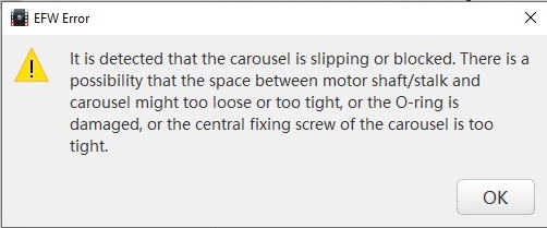 3. I use 7-position EFW, normally I had slots 1, 2, 3, 4 filled and slots 5, 6, 7 empty, but then I got the error below and the EFW stopped working. I checked the carousel. It was not too tight or loose.