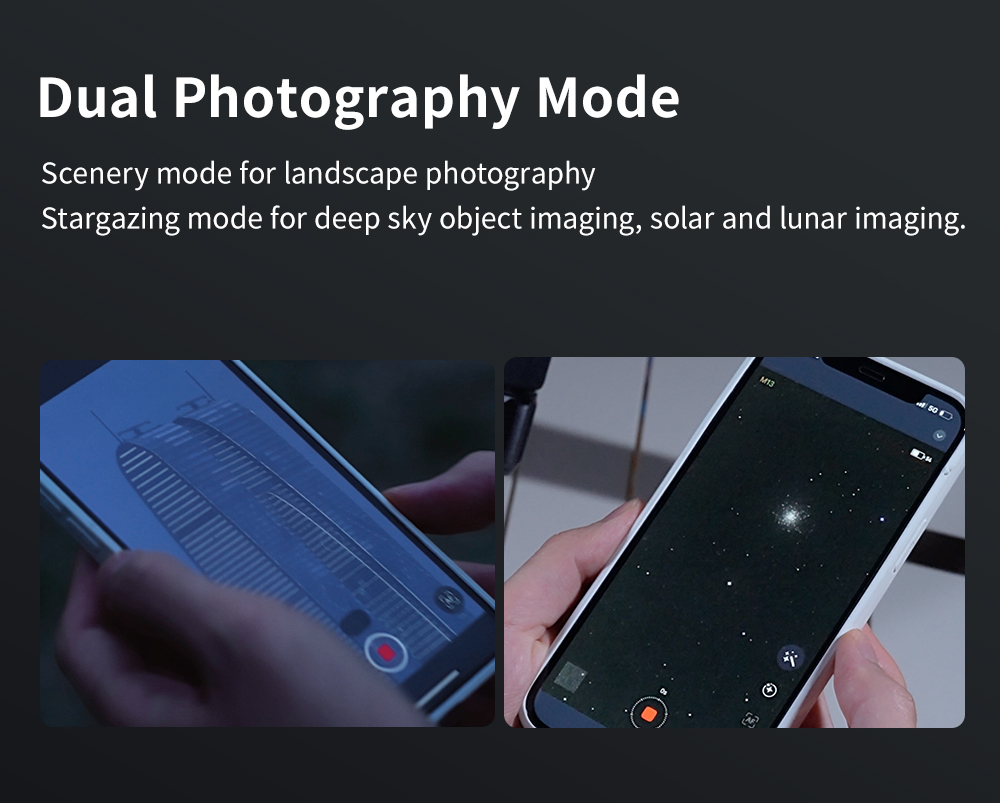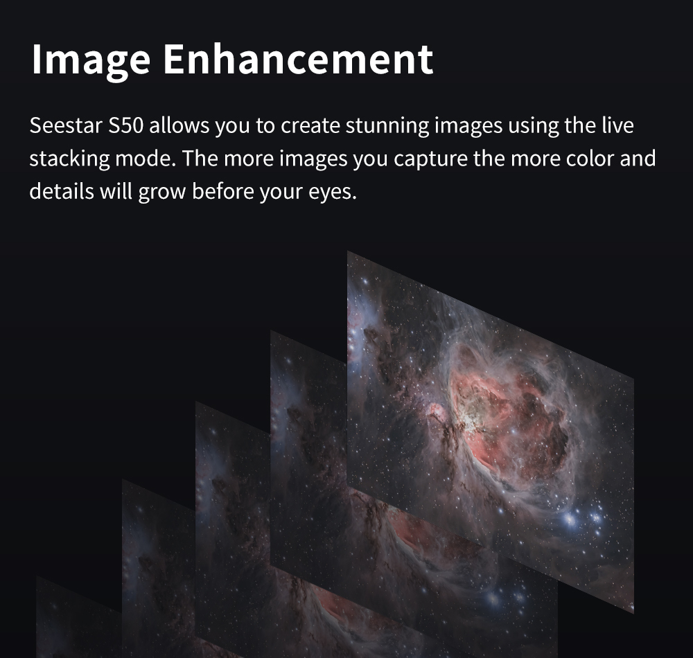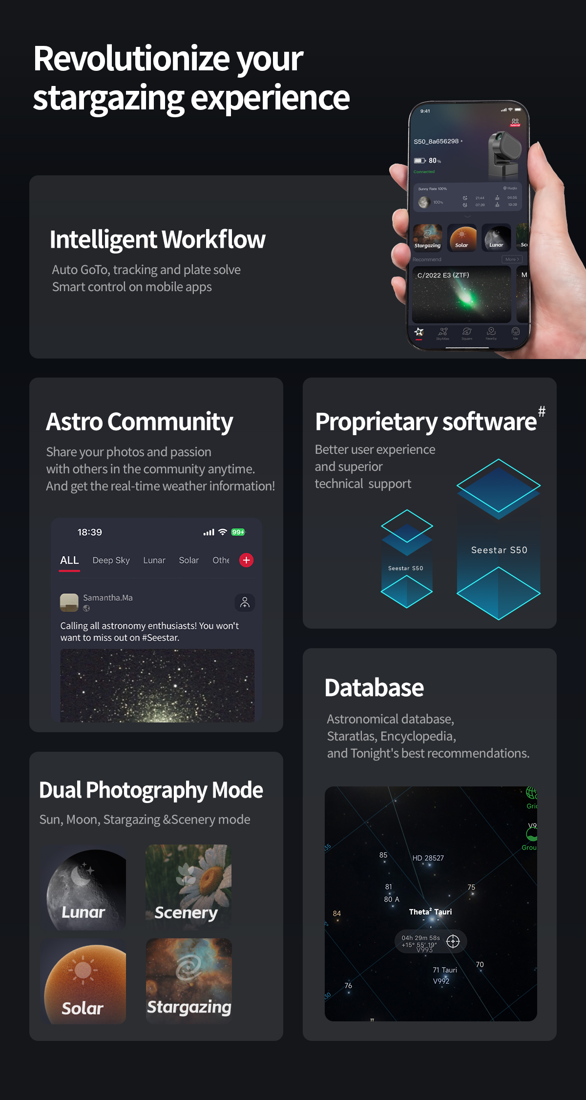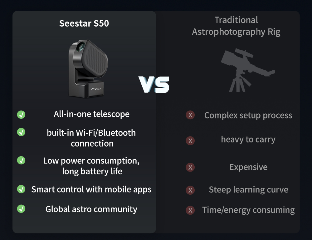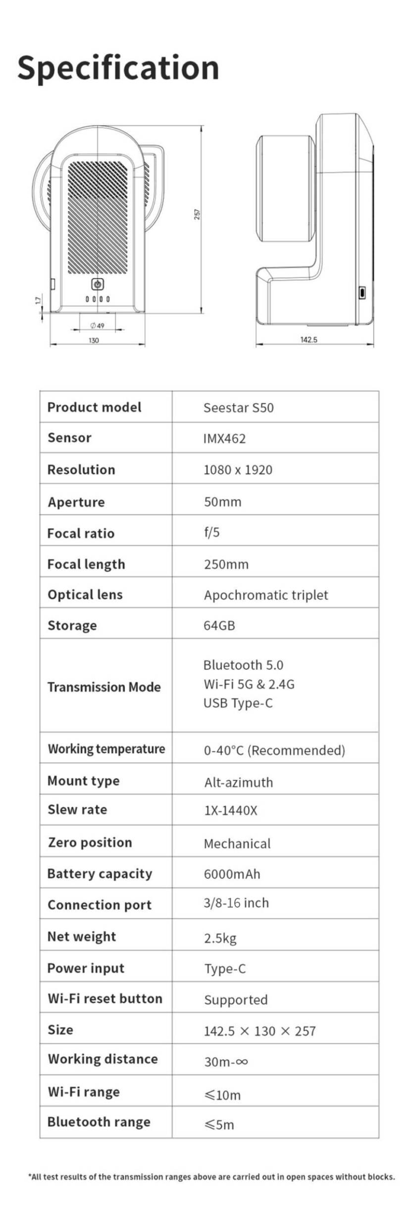 Technical Specifications Specification Details Core Specifications Product Model Seestar S50 Sensor Sony IMX462 Resolution 1920 × 1080 Optical System Aperture 50 mm Focal Ratio f/5 Focal Length 250 mm Optical Lens Apochromatic Triplet Connectivity & Storage Storage 64 GB (Internal) Transmission Wi-Fi / USB-C / Bluetooth Wi-Fi Bands 2.4 GHz & 5 GHz Wi-Fi Reset Supported Mount & Mechanical Mount Type Alt-Azimuth Slew Rate 20× – 1440× Zero Position Mechanical Connection Port 3/8"-20 Power Battery Capacity 6000 mAh Power Input USB Type-C Physical Net Weight 2.5 kg Size 142.5 × 130 × 257 mm Working Temperature 0°C to 40°C (Recommended)